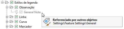 Neste exemplo, as configurações do recurso Geral fazem referência ao estilo Nota geral, por isso a caixa de seleção de Nota geral não pode ser desmarcada no momento.
