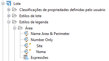 Na árvore Toolspace Configurações, a coleção Estilos de legenda contêm um ou mais tipos de estilos legenda que representam um aspecto único do objeto que esteja utilizando a mesma. A ilustração a seguir mostra a hierarquia da coleção de estilos de legenda, o tipos de estilo de legenda, e os estilos de legenda individual: