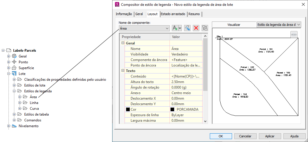 As legendas da área de lote aparecem no desenho conforme elas apareçam na visualização do Compositor de estilo de legenda