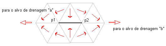 Este tipo de bacia hidrográfica é denominada entalhe de múltiplos drenos porque a água flui para o entalhe formado entre p1 e p2 e não pôde drenar a concentração de escoamento “a” ou a concentração de escoamento “b” como é mostrado na ilustração a seguir: