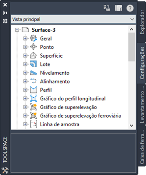 A janela Espaço de ferramentas pode exibir até quatro guias: Prospector, Configuraçãoou Topografía, e Caixa de ferramentas. A janela Panorama exibe guias nomeadas se você possui mais do que uma ferramenta (vista) ativa na janela.