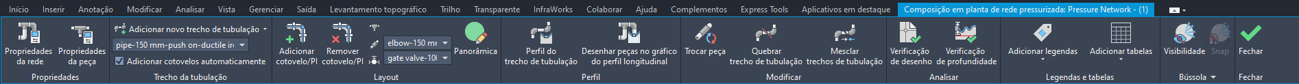 Para acessar a faixa de opções Composição em planta de rede pressurizada, execute uma das seguintes ações: