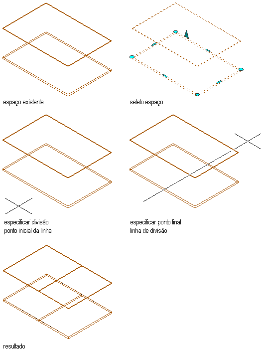 Dividir a manipulação dos estilos de linha ou um bloco contendo a manipulação dos estilos de linha em duas (ou mais) peças definidas por uma linha de divisão que você desenhar. A seguir, é possível selecionar as peças em cada lado da linha. Se um objeto de limite fechado é dividido em duas partes usando esta opção, ambas as peças são recriados como fechadas. Se uma polilinha aberta em um padrão ziguezague é dividida ao longo de seu comprimento, muitos segmentos selecionáveis são criados.