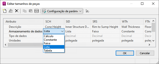 - Para adicionar uma lista de tamanhos de peças disponíveis para a peça, altere o tipo de armazenamento de dados de um parâmetro de tamanho para Lista.