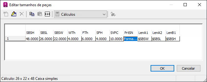 Nota: Os valores calculados definidos no modelo não podem ser editados na caixa de diálogo Editar Tamanhos de peça. Para alterar estes valores é preciso editar o modelo.