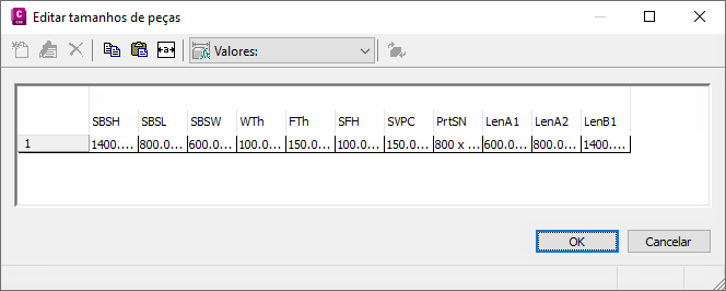Agora quando você clica no valor do parâmetro de tamanho que editou (por exemplo, LenB1) na caixa de diálogo Editar tamanhos de peça, a lista de tamanhos recém adicionada é exibida.