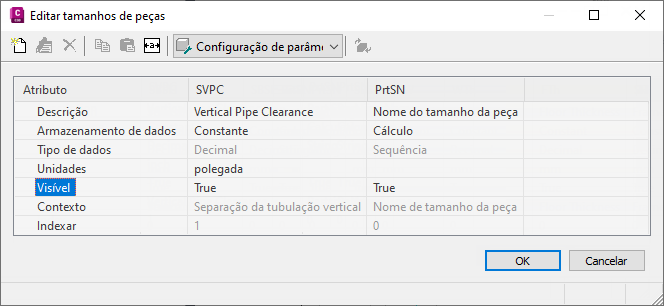 A caixa de diálogo Editar tamanhos de peça é exibida, mostrando todos os parâmetros de tamanho no momento disponíveis para a peça selecionada. Para o exemplo de Estrutura cilíndrica simples, alguns parâmetros de tamanho de peça são Nome do tamanho da peça (PrtSN) e Folga da tubulação de estrutura vertical (SVPC).