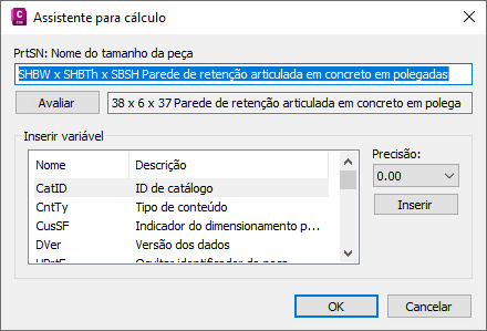 As sequências de cálculo associadas com os valores do parâmetro são exibidas. Por exemplo, a fórmula de cálculo para um Nome de tamanho de peça (PrtSN) para uma estrutura deveria ser “SHBW x SHBTh x SBSH polegadas da Parede de Retenção de Concreto”. Ou para uma tubulação, poderia ser FormatNumber($PID,0) + “ polegadas de Tubulação de Concreto”.