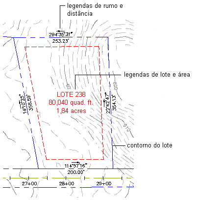 Cada lote possui uma legenda de área, que se refere ao lote como um todo. Você pode clicar na legenda de área para selecionar o lote. Um lote também poderá ter legendas de segmento e tabelas associadas, que exibem informações sobre o lote. Legendas poderão conter campos de propriedade definidos pelo usuário.