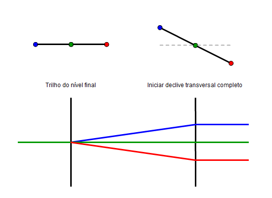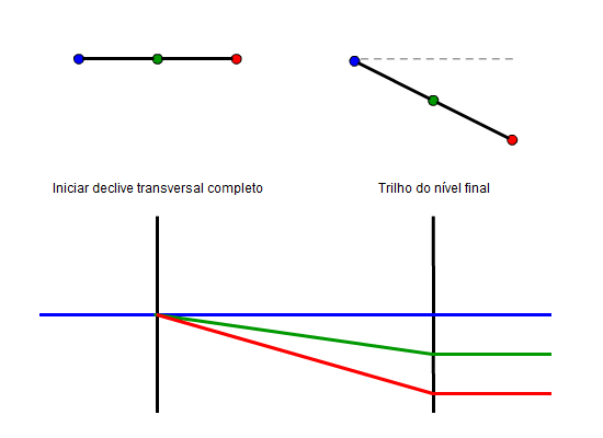 A ilustração a seguir descreve o método do pivô do lado alto do trilho para uma única ferrovia.