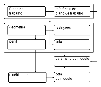 A ilustração a seguir mostra os recursos que compõem o modelo. As setas indicam a direção de relacionamento entre recursos. Por exemplo, alterar a geometria afeta um perfil, que afeta um modificador, e assim por diante. Consulte esta ilustração conforme você for aprendendo mais sobre cada recurso para ajudá-lo a compreender as relações entre as recursos.