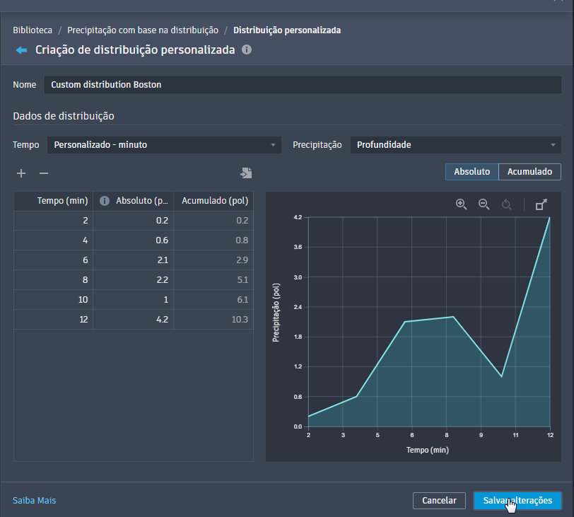 Nota: Os valores de profundidade e intensidade não são usados diretamente na análise de águas pluviais. Em vez disso, o percentual de precipitação em cada etapa de tempo é calculado dividindo a profundidade total do evento pela distribuição em cada intervalo.