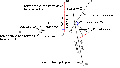 O ponto 100 é localizado na estaca 200 com um deslocamento zero. O ponto 101 é localizado na estaca 450 com a distância de deslocamento à esquerda de 91,44. O ponto 102 é localizado na estaca 600 com uma distância de deslocamento à direita de 152,4 e um ângulo de distorção de 50.