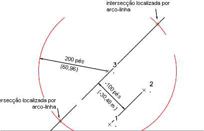 Intersecções estão localizadas entre um raio de arco de 200 com um centro no ponto 3 e uma linha desenhada entre os pontos 1 e 2 com uma distância de deslocamento de 100 para esquerda.