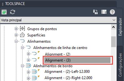 Alinhamentos da linha de centro na árvore Prospector. Utilize este comando para localizar rapidamente a localização do alinhamento de intersecção na árvore Prospector.