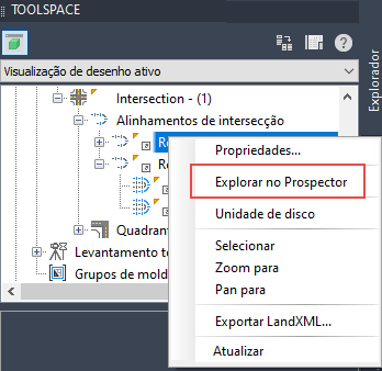 Para usar este comando, clique com o botão direito do mouse em um alinhamento na coleção Alinhamentos de intersecção e selecione Explorar no Prospector.