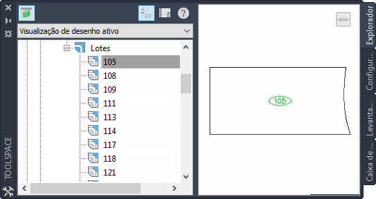 Quando o Toolspace estiver encaixado, a vista de lista é exibida abaixo os dados de árvore. Quando o Toolspace está desencaixado, é possível exibir a vista do item abaixo da árvore de dados ou para um lado dos dados da árvore, ao clicar no botão orientação de vista de item