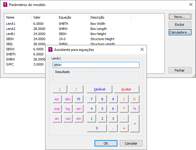 - Dê um duplo clique no valor da coluna Equação para obter um parâmetro modelo (tal como LenB1), e você poderá inserir um valor ou uma equação para especificar o comprimento da peça.