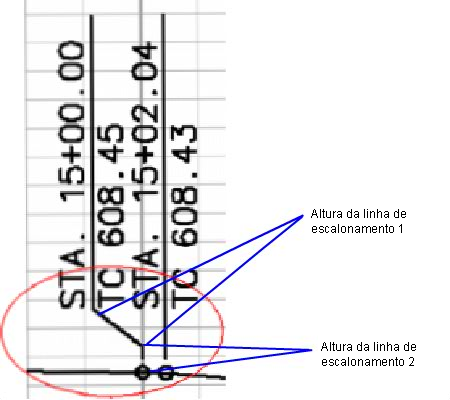 Utilize as opções de escalonamento de altura de legenda para evitar colisões de legenda em faixas de dados densamente preenchidas. As opções de escalonamento estão disponíveis nas Propriedades de gráfico do perfil longitudinal ou na paleta Propriedades do AutoCAD.
