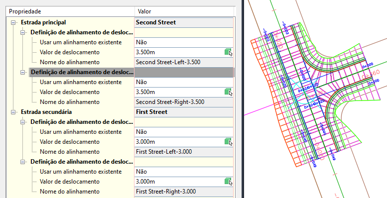 Realce do objeto no desenho: quando você seleciona alguns itens em uma caixa de diálogo de edição de intersecção, o objeto afetado é realçada no desenho. Por exemplo, quando você seleciona um deslocamento na caixa de diálogo Parâmetros de deslocamento de intersecção, o alinhamento do deslocamento é realçado no desenho. Este comportamento é exibido na ilustração a seguir.