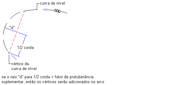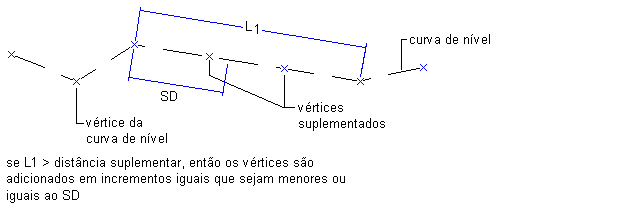 A distância suplementar é a distância máxima entre os vértices. Se a distância entre vértices em uma curva de nível for maior do que o fator suplementar, os pontos serão adicionados ao longo da curva de nível em intervalos iguais que sejam menores ou iguais à distância suplementar. Quanto menor a distância, maior será o número de pontos suplementares.