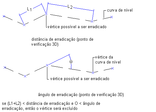 Um ponto sobre a curva de nível é erradicada ao calcular a sua localização em relação aos vértices anteriores e posteriores. Se o comprimento entre estes três pontos é menor do que o valor de comprimento de erradicação e o ângulo de deflexão é menor do que o valor de ângulo de erradicação, o ponto central não é adicionado ao arquivo de dados de curva de nível.
