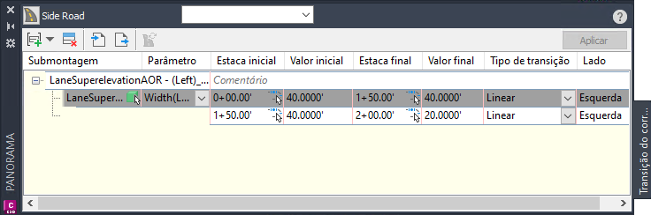 Também é possível especificar valores na vista Panorama de transição do corredor.