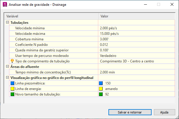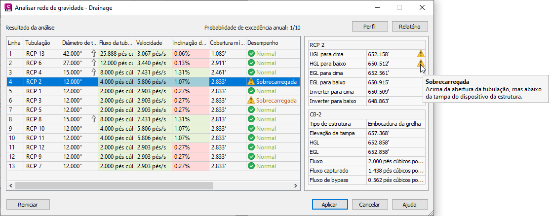 É possível utilizar o comando Analisar rede de gravidade para redimensionar as tubulações e redefinir as geratrizes e para calcular as linhas de declividade de energia e hidráulica de acordo com as normas HEC-22.