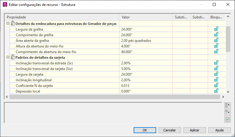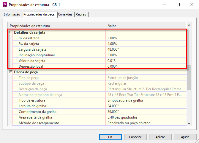 É possível utilizar a seção Detalhes da sarjeta na caixa de diálogo Propriedades da estrutura para definir propriedades da área da rodovia ao redor da embocadura. Essas propriedades são usadas pelo comando Analisar rede de gravidade para cálculos de análise da embocadura.