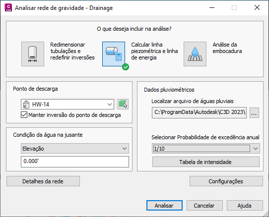 Há três tipos de análise que você pode selecionar: Redimensionar as tubulações e redefinir as geratrizes, Calcular as linhas de declividade de energia e hidráulica e Análise da embocadura.