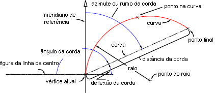| raio | A distância desde um ponto central para a curva. Escreva este valor nas unidades de distância da banco de dados de levantamento topográfico actual. Utilize um raio negativo para desenhar a curva em sentido anti-horário (esquerda). |