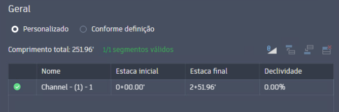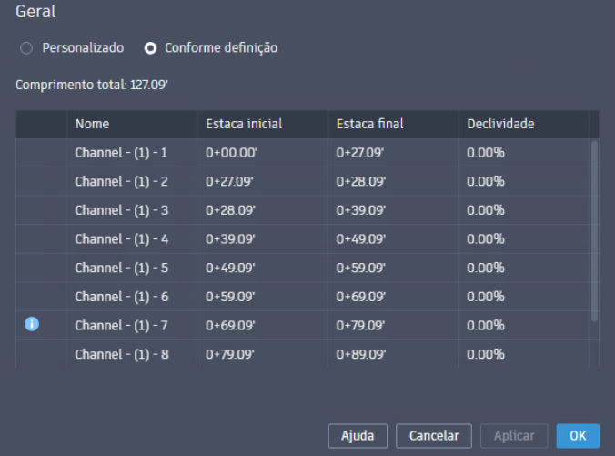 Estaca inicial. Exibe a estaca inicial de cada segmento de canal. O valor deve estar dentro da faixa de estacas definida, caso contrário, um erro será exibido.