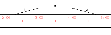 As transições se estendem para frente e para trás a partir das estacas especificadas inicial e final do alargamento. No exemplo mostrado, o alargamento começa na estaca 3+00 e o comprimento da transição é de 75, então a transição de entrada começa em 2+25.