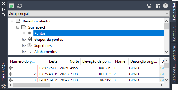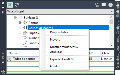 A janela Toolspace é um componente de inteiro na interface do usuário para acessar os comandos, estilos e dados. Utilize-a para acessar as guias Prospector, Configurações,, Levantamento topográfico e a Caixa de ferramentas. Clique com o botão direito do mouse em cada coleção ou item nestas guias para acessar os comandos.