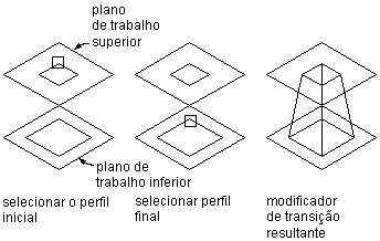Um modificador de transição cria um corpo de transição entre dois perfis. Uma transição inclui perfis inicial e final, que podem estar no mesmo plano de trabalho. Referências de ponto são úteis para assegurar que os perfis se alinhem entre planos de trabalho; no entanto, os centros não precisam se alinhar.