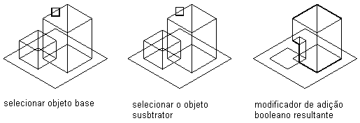Um modificador de subtração booleana subtrai um ou mais recursos de outro para criar um novo recurso. O modificador de subtração booleana utiliza uma fórmula básica ao criar o recurso resultante: que o objetos subtraídos são removidos do objeto base. Para ver os resultados no modelo, os recursos do subtrator precisam efetuar a intersecção com a operação base. Quando não há nenhuma intersecção dos recursos existentes, o recurso do subtrator é removido do recurso base sem alterações visíveis no modelo.