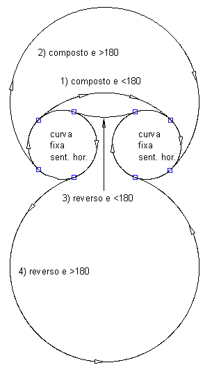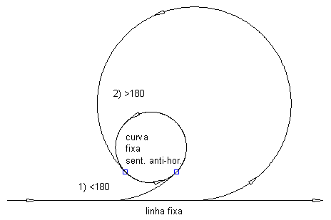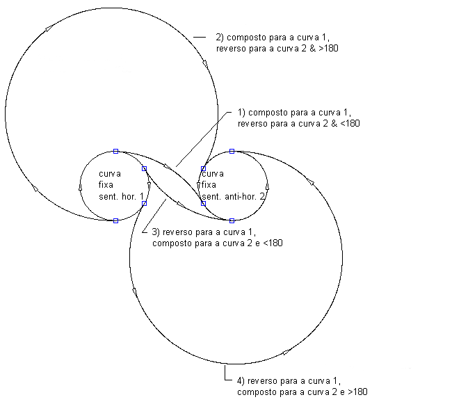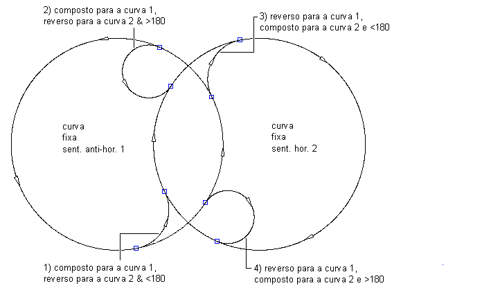 A ilustração a seguir mostra uma curva de livre concordância entre uma curva fixa no sentido horário e uma curva fixa no sentido anti-horário: