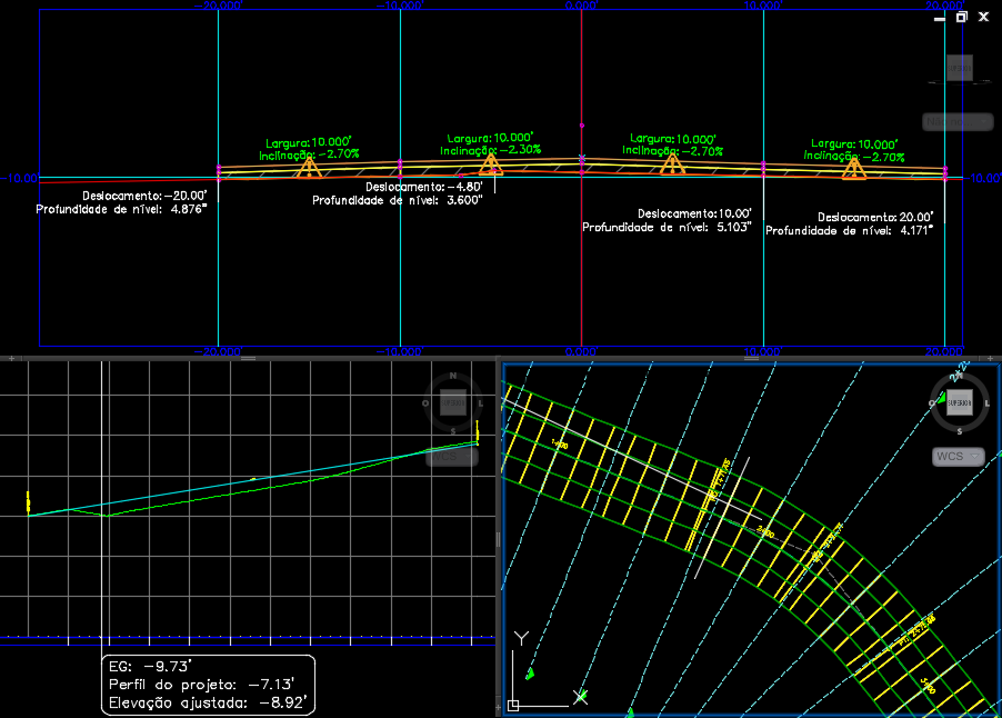 Quando você seleciona uma região de reabilitação em um corredor de reabilitação, três viewports padrão são exibidas, permitindo que você veja a seção transversal do corredor para a estaca (gráfico de seção transversal), o perfil vertical da seção (gráfico de perfil longitudinal) e o local da seção transversal do corredor ao longo do alinhamento do corredor de reabilitação (vista de planta).