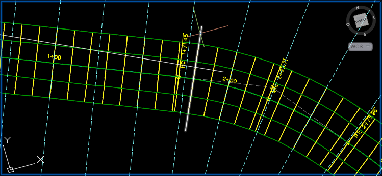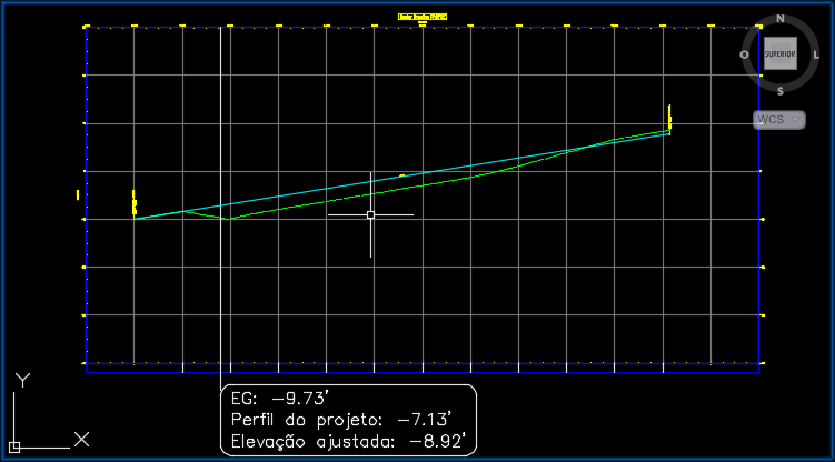 Elevação do perfil de projeto para a estaca selecionada. A elevação de perfil de projeto de uma região do corredor de reabilitação é definida pela linha de base vertical que foi atribuída ao corredor de reabilitação em Propriedades de corredor durante a criação do corredor de reabilitação.