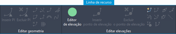 Quando a linha de recurso estiver vinculada de forma dinâmica com um corredor, a maioria dos comandos de edição da linha de recurso não estão disponíveis a partir da faixa de opções. A ilustração a seguir mostra os painéis de edição na guia contextual da faixa de opções Linha de recurso quando uma linha de recurso dinâmica estiver selecionada. Você pode usar o Editor de elevação e a Edição rápida de elevação para exibir os dados, mas não para editá-los.