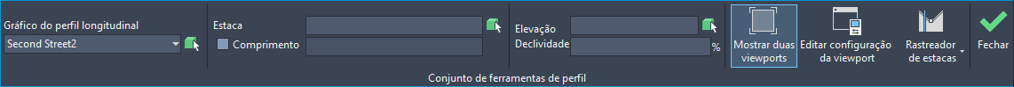 A configuração da viewport é alterada para exibir duas viewports, uma mostrando a vista da planta e a outra mostrando o gráfico do perfil longitudinal.