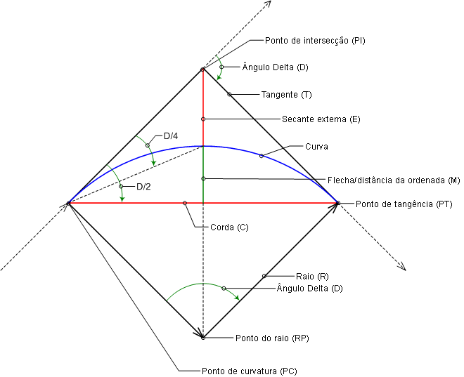 A ilustração a seguir mostra os parâmetros de curva usados pelo Autodesk Civil 3D