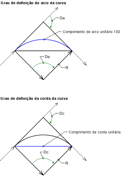 - Definição de arco: especifica que o grau de curvatura é determinado pelo arco. Use esta opção se a curva for uma curva de rodovia. Para uma curva de rodovia, o grau da curva é o ângulo central subtendido por um arco circular de 100 unidades.