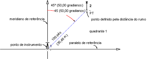 O ponto 2 é localizado ao transformar um rumo de 45°0'0" (50 gradianos) em Quadrante 1 (NE) em uma distância de 100 pés do ponto de instrumento, com a descrição PT.