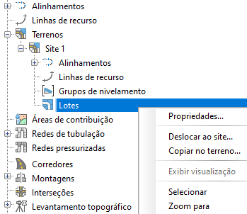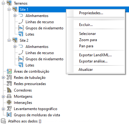Acesse estas propriedades clicando com o botão direito do mouse no nó denominado da coleção de terrenos (por exemplo, Terreno 1) na Árvore do Prospector.