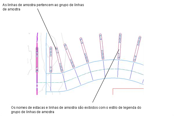 Ao criar linhas de amostra ao longo de um alinhamento, objetos de seção também criados para um conjunto específico de superfícies propostas existentes, modelos de corredor ou redes de tubulação. Cada estilo padrão da linha de amostra e objeto de amostra são especificados através de um grupo de linhas de amostra. Outros objetos de amostra podem ser adicionados ao grupo de linhas de amostra após as linhas de amostra terem sido criadas. Para plotar as seções no desenho, crie diferentes vistas de seção ou vistas com várias seções.