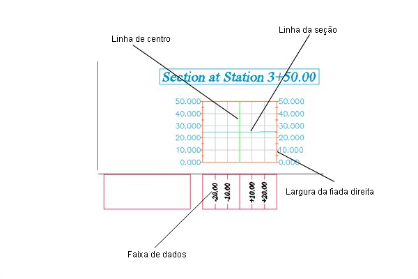 O objeto de gráfico da seção exibe dados seccionais (terreno existente e terreno acabado/projetado) ao longo de uma linha de amostra, em qualquer estaca fornecida ao longo de um alinhamento horizontal. Um gráfico da seção mostra uma seção criada a partir de uma superfície (TIN ou corredor), um corredor (que é uma montagem em uma estaca especificada) ou uma rede de tubulação. As faixas também podem ser exibidas abaixo ou acima do gráfico da seção