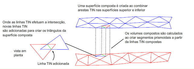 Este método utiliza os pontos das duas superfícies, bem como em qualquer localização onde as bordas dos triângulos entre as duas superfícies de intersecção para criar segmentos prismoidais compostos de linhas TIN.