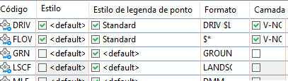 O que se segue são amostras de chave de descrição, mostrando código, estilo de ponto, estilo de legenda de ponto, formato, e propriedades de camada: