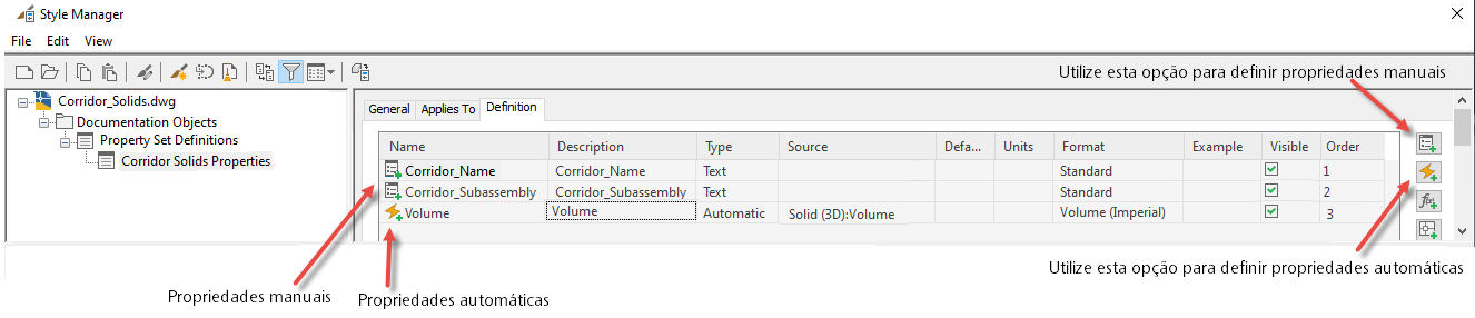 Crie um novo conjunto de propriedades e configure propriedades manuais e automáticas para associar com os objetos.